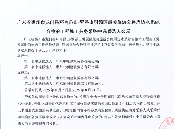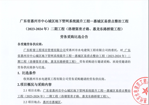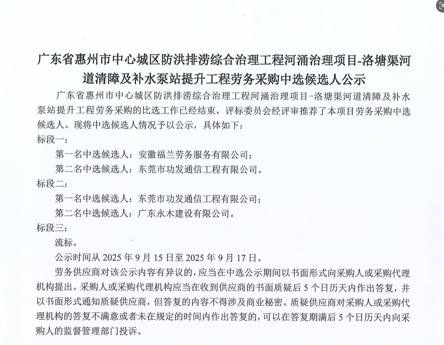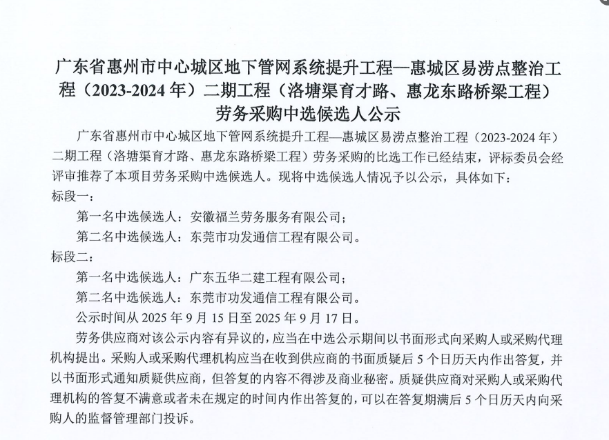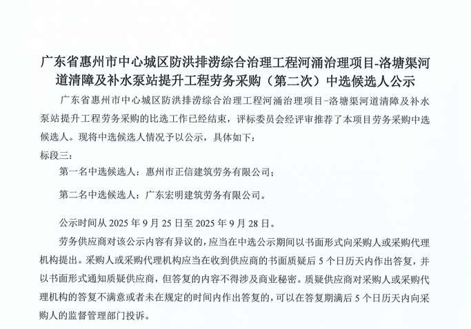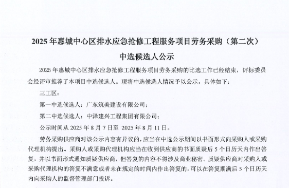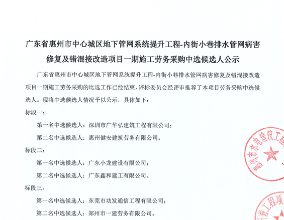 廣東省惠州市中心城區(qū)地下管網(wǎng)系統(tǒng)提升工程-內(nèi)街小巷排水管網(wǎng)病害修復及錯混接改造項目一期施工勞務采購(第二次)中選候選人公示……